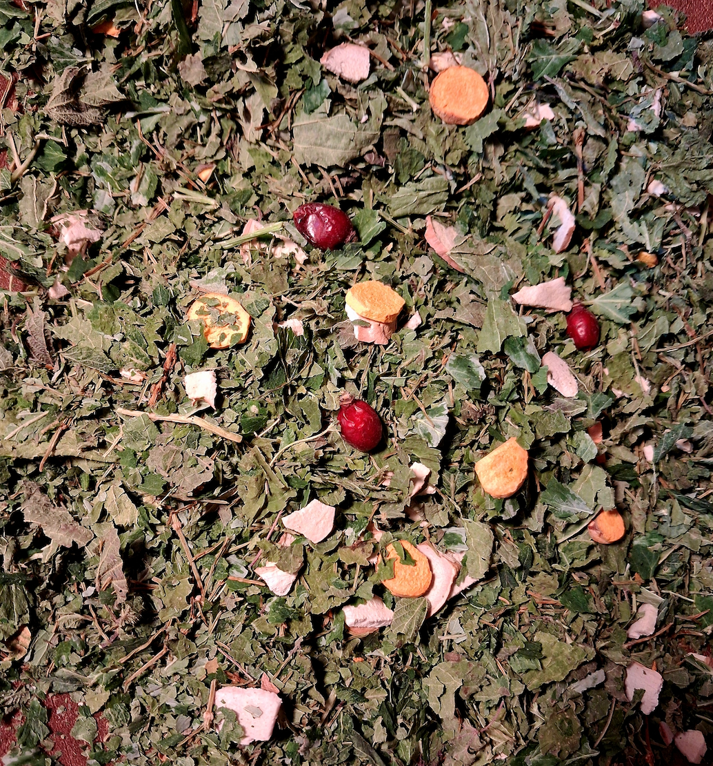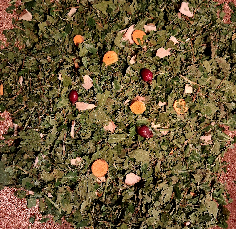 Skład stanowią wybrane zioła: pokrzywy zwyczajnej, skrzypu polnego, podagrycznika, owoc dzikiej róży, korzeń kurkumy, imbiru, w tym liofilizowane składniki o pełnej wartości odżywczej